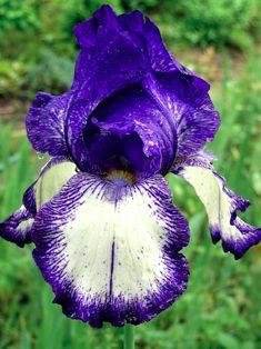 Саженцы ириса германского Гоуинг май Вэй (Iris germanica Going my Way) относятся к бородатым ирисам – на нижних лепестках имеется полоска ворсинок яркой контрастной окраски, напоминающая бородку. Плотный крепкий цветонос достигает в высоту 95-100 сантиметров. На нем образуется от 1 до 7 бутонов. Форма цветка очень красивая – три верхних внутренних лепестка образуют купол, а три наружных – юбочку. Окрас неоднородный – верхние лепестки фиолетовые с белым мазком по центру, нижние – белые с темно-фиолетовой каймой. Бородка – сиреневая. Размер цветка – 10-15 сантиметров в диаметре.