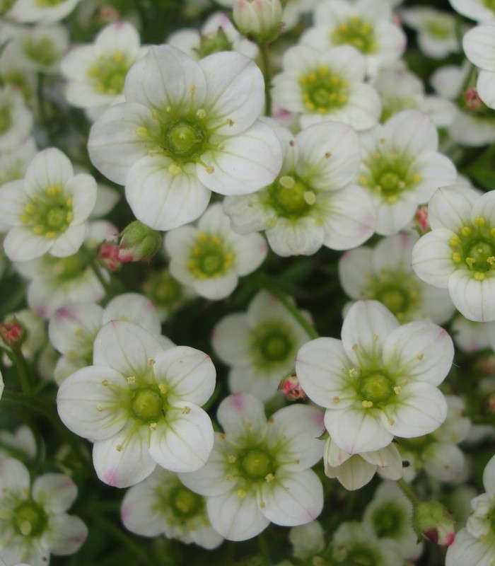 Саженцы камнеломки Арендса Пикс Вайт (Saxifraga arendsii Pixie White) – утонченный сорт данного вида растений с декоративными сливочно-белыми цветочками с зеленой сердцевинкой. Растение невысокое – около 10-15 сантиметров в высоту. Листочки красивые, интенсивного темно-зеленого цвета, тонкие пятираздельные, собраны в прикорневую розетку. Над подушкой вечнозеленого куста возвышаются цветоносы с небольшими цветочками 2-2,5 сантиметров в диаметре. Камнеломка предпочитает рыхлые, проницаемые почвы с хорошим дренажом. В период завязывания бутонов и цветения необходим своевременный умеренно-обильный полив.