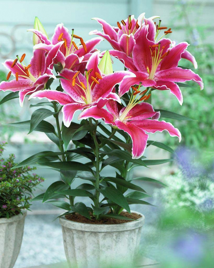 Луковицы лилии восточной горшечной Старлайт Экспресс (Lilium oriental Starlight Express) — стильное решение для украшения сада и выращивания в горшках. Кусты не отличаются крупными размерами и вырастают до 55 см в высоту, но они очень пышные. В конце лета начинают распускаться бутоны в большом количестве и практически полностью закрывают собой зелень. Цветы достигают 19 см в диаметре, очень ароматные. Они ярко-розовые с волнистой белой каймой и плавным градиентом к темно-бордовому центру. Лилия Старлайт Экспресс проста в уходе. Если ее поливать, подкармливать минеральными смесями и укрывать на зиму, она стойко переносит перепады температур и может оставаться на зиму в открытом грунте. Благодаря небольшому размеру сорт также выращивают в качестве домашнего растения в горшках.