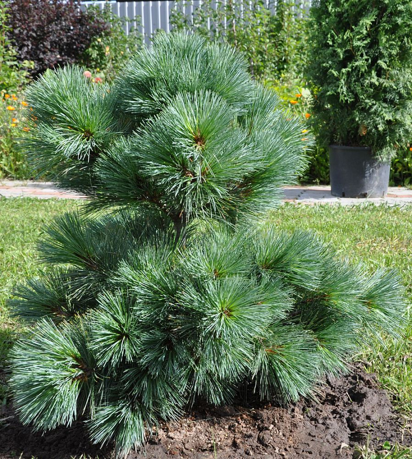 Саженцы сосны Веймутова Радиаты (Radiata) – проверенный годами сорт хвойных кустарников с ажурными округлыми кронами, усеянными свечами светлых шишек. Высота крупномеров достигает 2 м. Диаметр кроны 1,5-2 м. Форма кроны неравномерно-округлая. Компактность растения позволяет его использовать в любых ландшафтных вариациях. Особо примечательна сосна Веймутова Радиата своей мягкой длинной хвоей и смолистыми светло-бурыми почками. Достоинства: