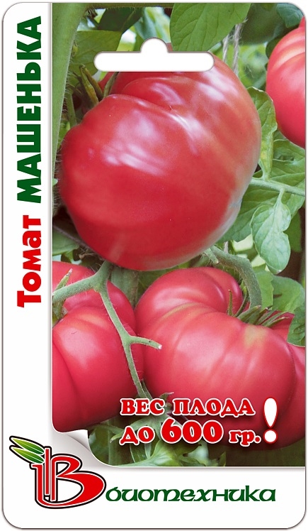 Семена томата "Машенька" (Mashenka) позволяют получать урожай, отличающийся дружным созреванием и великолепным вкусом. Это раннеспелый сорт, вегетационный период от всходов до сбора урожая составляет 92-94 дня. Растение индетерминантное, среднеоблиственное, высотой 1,9-2 метра. Плоды округлой формы, ярко-красные, гладкие, мясистые. Средний вес варьируется от 400 до 600 грамм. Урожайность до 5-6 кг с одного куста. Сорт устойчив к поражению фитофторозом, мозаикой и фузариозом. Урожай можно использовать в свежем виде и консервации.